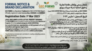This document serves as the formal public declaration of the GEO FARMS Trademark, which is legally registered and owned exclusively by GEO EXPORTING (Egypt). To ensure the protection of our global partners and the integrity of our high-quality agricultural exports, we are providing this public record of our intellectual property rights.
