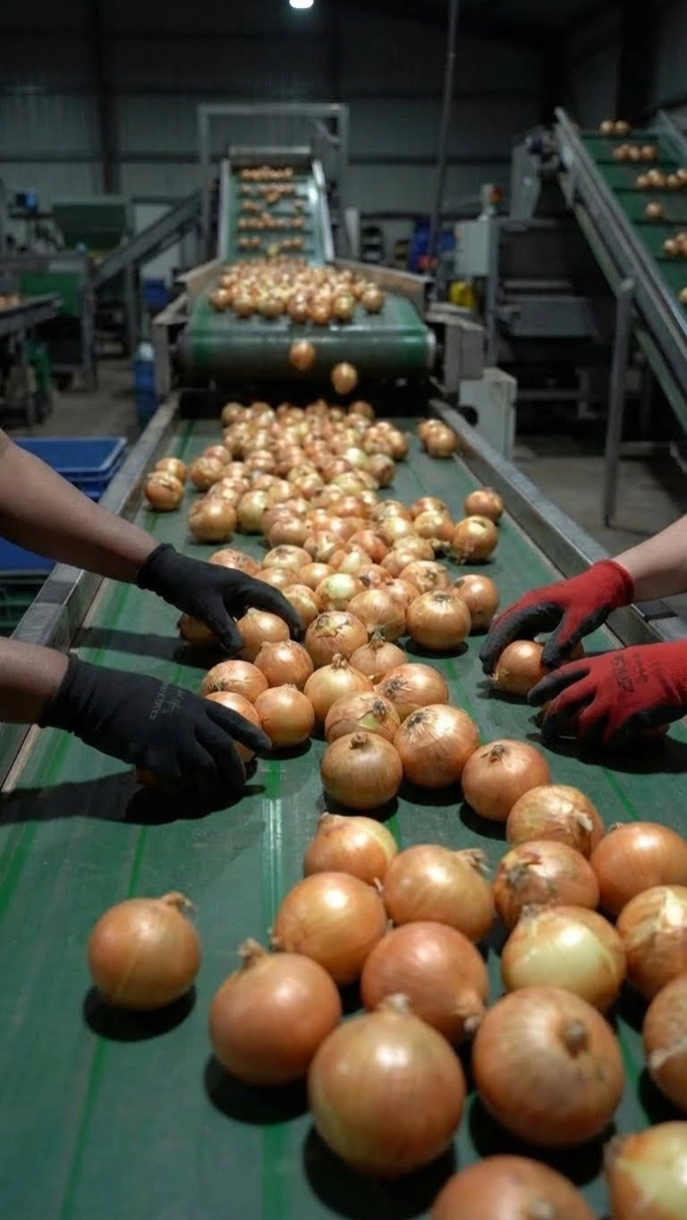 Mechanical sizing sorts onions by exact millimeter diameter, while manual inspection removes defects to ensure Class 1 export quality.